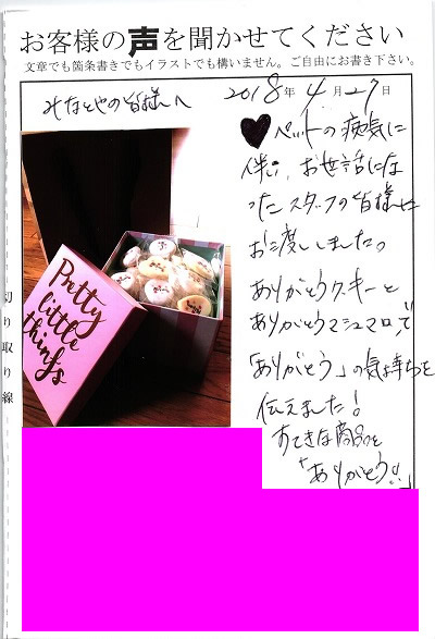 ペットの病気に伴い、お世話になったスタッフの皆様にお渡ししました。ありがとうクッキーとありがとうマシュマロ。「ありがとう」の気持ちを伝えました!すてきな商品を「ありがとう!」
