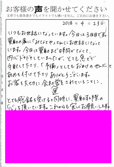 いつもお世話になっています。今回で3回目です。異動の度に「みなとや」さんにお世話になっています。今回は異動までの時間がなくて、内心ドキドキしていましたがとても急ぎで手配してくださり「予備」としてもおまけのせんべいとあめを付けて下さりありがとうございましす。お客を大切に会社運営をされていることにとても感銘をうけると同時に異動する際の「心」を頂いています。これからも宜しくお願いします。