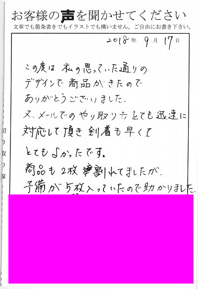 この度は私の思っていた通りのデザインで商品がきたのでありがとうございました。又、メールでのやり取りもとても迅速に対応して頂き到着も早くてとてもよかったです。商品も2枚割れてましたが予備が5枚入っていたので助かりました。
