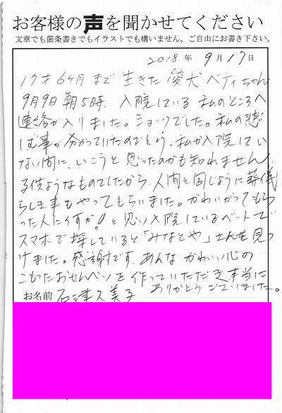 17才6ヶ月まで生きた愛犬ベティちゃん9月9日朝5時、入院している私のところへ連絡が入りました。ショックでした。私の悲しむことが分かっていたのでしょう。私が入院していない間にいこうと思ったのかもしれません。子供のようなものでしたから。人間と同じように葬儀らしきこともやってもらいました。かわいがってもらった人に何か!と思い入院しているベットでスマホで探していると「みなとや」さんを見つけました。感謝です。あんなかわいい心のこもったおせんべいを作っていただき本当にありがとうございました。