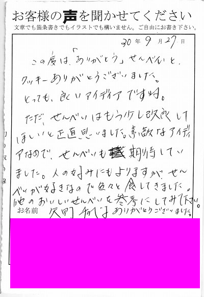 この度は「ありがとう」せんべいとクッキーをありがとうございました。とっても良いアイディアですね。ただ、せんべいはもう少し改良してほしいと正直思いました。素敵なアイデアなのでせんべいも期待していました。人の好みにもよりますがせんべいが好きなので色々と食してきました。他のおせんべいを参考にしてみて下さい。ありがとうございました。