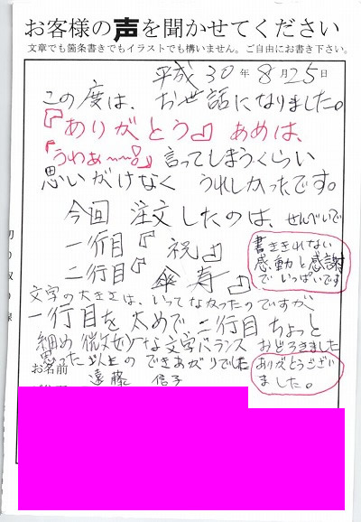 この度はお世話になりました。『ありがとう』あめは、「うわぁ~~!」言ってしまうくらい思いがけなくうれしかったです。今回注文したのは、せんべいで一行目『祝』二行目『傘寿』文字の大きさはいってなかったのですが一行目を太めで、二行目ちょっと細め微妙な文字バランスおどろきました。思った以上のできあがりでした。ありがとうございました。