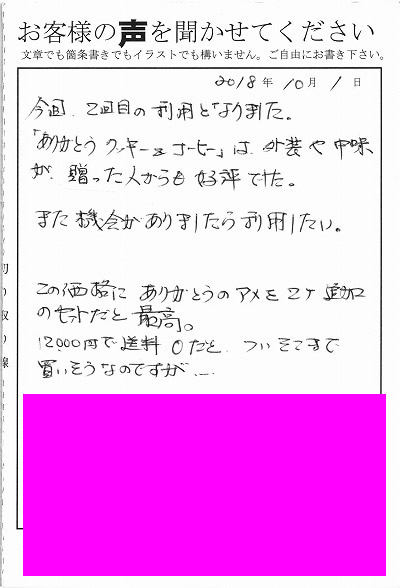 今回、2回目の利用となりました。「ありがとうクッキー&コーヒー」は外装や中味が贈った人からも好評でした。また機会がありましたら利用したい。この価格にありがとうのアメを2ケ追加のセットだと最高。12000円で送料0円だとついそこまで買いそうなのですが・・・。