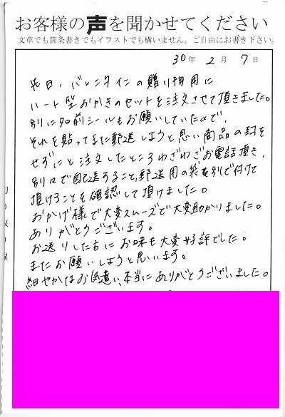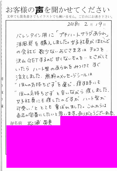 先日、バレンタインの贈り物にハート型おかきのセットを注文させて頂きました。別に名前シールもお願いしていたのでそれを貼ってまた郵送しようと思い商品の封をせずにと注文したところわざわざお電話頂き、別々で配送すること郵送用の袋を別で付けて頂けることを確認して頂けました。おかげ様で大変スムーズで大変助かりました。ありがとうございます。お送りした方にお味も大変好評でした。またお願いしようと思います。細やかなお気遣い本当にありがとうございました。