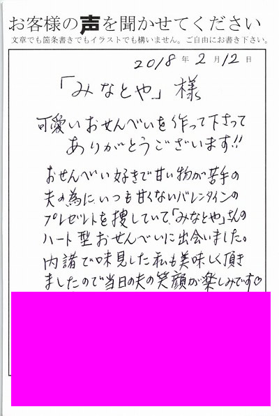 可愛いおせんべいを作って下さってありがとうございます!!おせんべい好きで甘いものが苦手の夫の為にいつも甘くないバレンタインのプレゼントを捜していて「みなとや」さんのハート型おせんべいに出会いました。内緒で味見した私も美味しく頂きましたので当日の夫の笑顔が楽しみです。