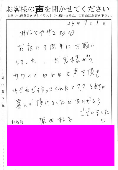 お店の3周年にお願いしました。お客様からカワイイと声を頂きわざわざ作ってくれたの??とめちゃ喜んで頂けました。ありがとうございました!!