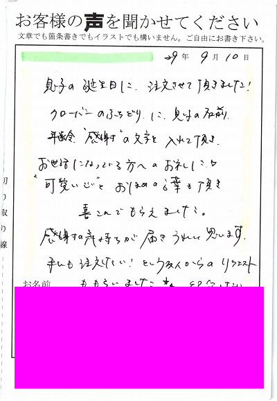 息子の誕生日に注文させて頂きました!クローバーのふちどりに、息子の名前、年齢、感謝の文字を入れて頂きお世話になっている方へのお礼に可愛いとおほめの言葉も頂き、喜んでもらえました。感謝の気持ちが届きうれしくと思います。私も注文したい!という友人からのリクエストももらいました。