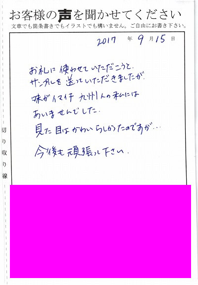 お礼に使わせていただこうとサンプルを送っていただきましたが味がイマイチ。九州人の私にはあいませんでした。見た目はかわいらしかったのですが・・・。今後も頑張って下さい。