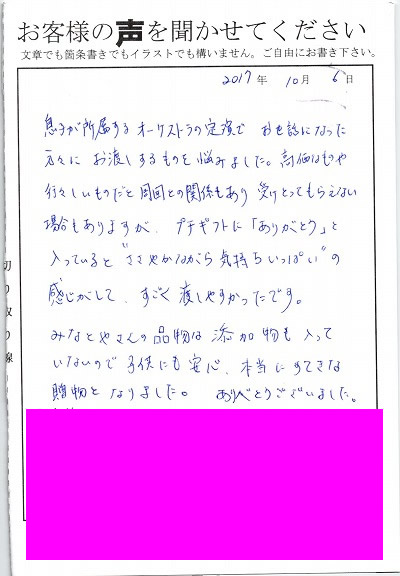息子が所属するオーケストラの定演でお世話になった方々にお渡しするものを悩みました。高価なものや仰々しいものだと周囲との関係もあり、受け取ってもらえない場合もありますがプチギフトに「ありがとう」と入っているささやかながら気持ちいっぱいの感じがしてすごく渡しやすかったです。みなとやさんの品物は添加物も入っていないので、子供にも安心、本当にすてきな贈り物となりました。ありがとうございました。