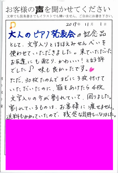 大人のピアノ発表会の記念品として文字入りとほほえみせんべいを使わせていただきました。来ていただいたお友達にも配りかわいい!と好評でした。味も良かったです。ただ、30枚たのんでヨビに3枚付けていただいたのに、箱を開けたら4枚文字入りの方が割れていて、困りました。割れているものはお客様に渡せません。送料かかっていたので、残念な気持ちになりました。