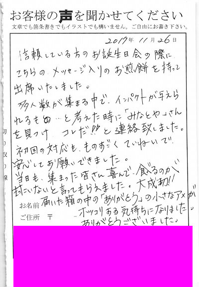 信頼している方のお誕生会の際にこちらのメッセージ入りのお煎餅を持って出席いたしました。大人数が集まる中で、インパクトが与えられるもの・・・と考えた時、「みなとや」さんを見つけ、コレだ!!と連絡致しました。初回の対応もものすごくていねいで安心してお願いできました。当日も集まった皆さん喜んで食べるのがもったいないと言ってもらえました。大成功!!届いた箱の中の「ありがとう」の小さなアメがホッコリする気持ちになりました。ありがとうございました。