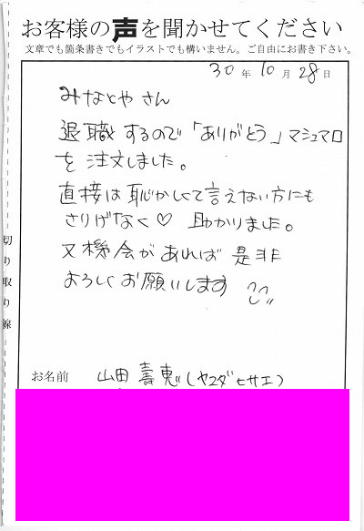 退職するので「ありがとう」マシュマロを注文しました。直接は恥ずかしくて言えない方にもさりげなく助かりました。又機会があれば是非よろしくお願いします。