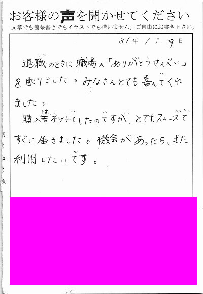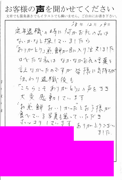 退職あいさつのお客様の声 105 『職場へ「ありがとうせんべい」を配りました。みなさんとても喜んでくれました。』