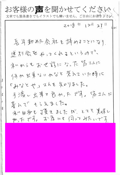 長年勤めた会社を辞めることになり送別会をやってくれるというので、私からもお世話になった皆さんに何か出来ないかなと考えていた時に「みなとや」さんを知りました。手渡し出来て良かったです。皆さんに喜んでもらえました。私自身も頂きましたがとても美味しかったです。お店にも伺ってみたいです。ありがとうございました。