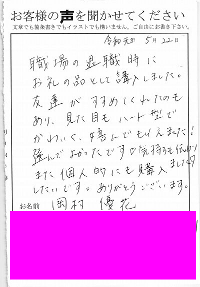 職場の退職時にお礼の品として購入しました。友達がすすめてくれたのもあり、見た目もハート型でかわいく、喜んでもらえました!選んでよかったです。気持ちも伝わりました。また個人的にも購入したいです。ありがとうございます。