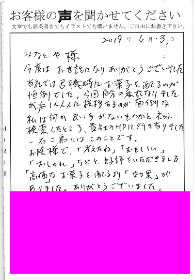 今度はお世話になりありがとうございました。当社では退職時にお菓子を配るのが恒例でした。今回自分の番になりましたが、1人1人に挨拶するのが面倒な私は何か良い手がないものかとネット検索したところ貴社のHPに行き当たりました。一石二鳥とはこのことです。お陰様で「考えたね」「おもしろい」「おしゃれ」などと好評をいただきました。「高価」なお菓子を配るより「効果」がありました。ありがとうございました。