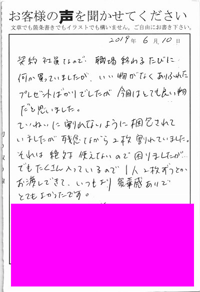 退職あいさつのお客様の声 112 『おせんべいにメッセージ入り、なかなかめずらしくそしておいしい!ということで喜んでもらえました』