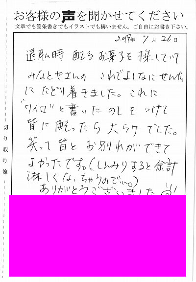 退職あいさつのお客様の声 114 『文字「ありがとう」のあたたかみと、ハート型のおせんべいが可愛く喜ばれました。』