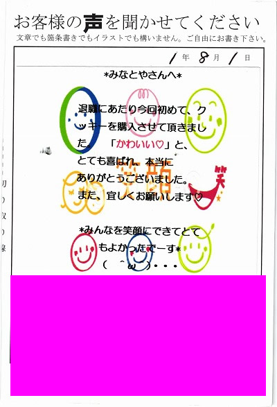 みなとやの皆様へ♡初めて注文させて頂いたのは今から3年前。お世話になった方々へピッタリの、素敵な贈りものができ、今でもお付き合いがあり、”あのクッキー“がかわいかったと喜んで頂いておりました。今回も、わかれの時が来たのでまた素敵な贈り物を、大好きな方々へと想い、リピートさせて頂きました。いつもていねいに梱包して頂きありがとうございます。みなとやさん大好き♡