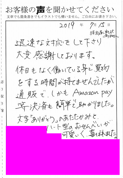 迅速な対応をして下さり大変感謝しております。休日もなく働いてる身で、買物をする時間が持てませんでしたが通販で、しかもAmazon Pay等決済も簡単で助かりました。文字「ありがとう」のあたたかみと、ハート型のおせんべいが可愛く喜ばれました。(職場の方に)