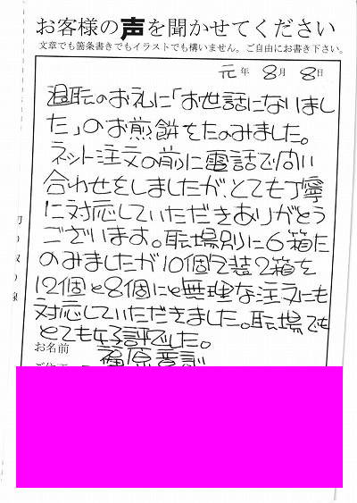 退職のお礼に「お世話になりました」のお煎餅をたのみました。ネット注文の前に電話で問い合わせをしましたが、とても丁寧に対応していただきありがとうございます職場別に6箱たのみましたが10個包装2箱を12個と8個にと無理な注文にも対応していただきました。職場でもとても好評でした。