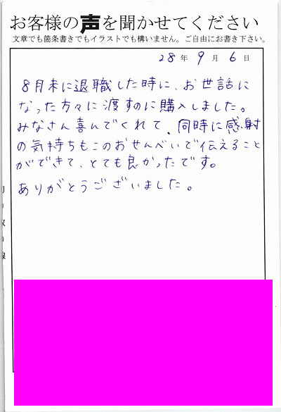 8月末に退職した時にお世話になった方々に渡すのに購入しました。みなさん喜んでくれて、同時に感謝の気持ちもこのおせんべいで伝えることができ、とても良かったです。ありがとうございました。