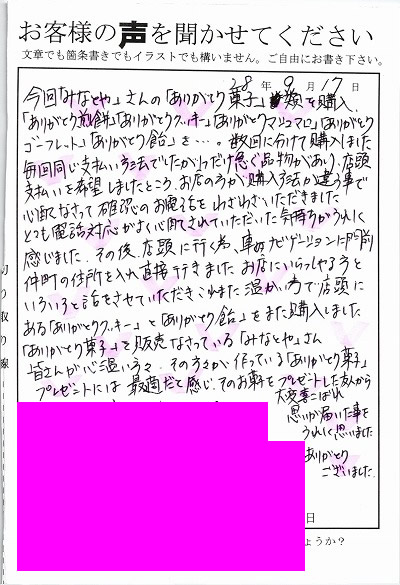 今回みなとやさんの「ありがとう菓子」類を購入。「ありがとう煎餅」「ありがとうクッキー」「ありがとうマシュマロ」「ありがとうゴーフレット」「ありがとう飴」を・・・。数回に分けて購入しました。毎回同じ支払い方法でしたが1つだけ急ぐ品物があり、店頭支払いを希望しましたところ、お店の方が購入方法が違う事で心配なさって確認のお電話をわざわざいただきました。とても電話対応がよく心配されていただいた気もちがうれしく感じました。その後、店頭に行く為、車のナビゲーションに門前仲町の住所を入れ直接行きました。お店にいらっしゃる方といろいろ話をさせていただき、これまた温かい方で店頭にある「ありがとうクッキー」と「ありがとう飴」をまた購入しました。「ありがとう菓子」を販売なさっている「みなとやさん」皆さんが心温かい方々。その方々が作っている「ありがとう菓子」プレゼントには最適だと感じ、そのお菓子をプレゼントした友人から大変喜ばれ思いが届いた事をうれしく思いました。ありがとうございました。