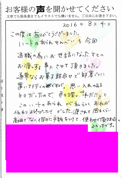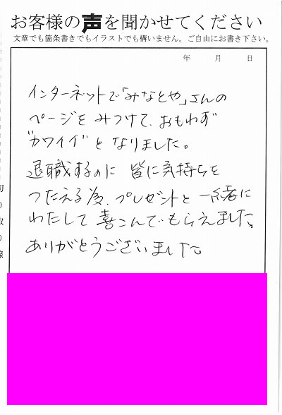 インターネットで「みなとや」さんのページをみつけておもわず”カワイイ”となりました。退職するのに皆に気持ちをつたえる為、プレゼントと一緒にわたして喜んでもらえました。ありがとうございました。