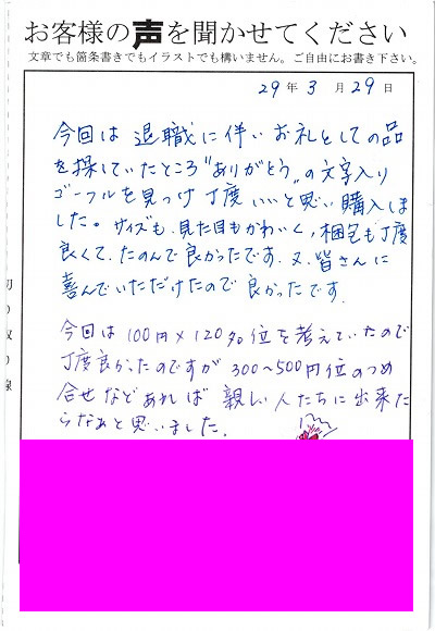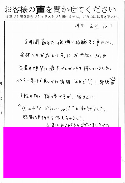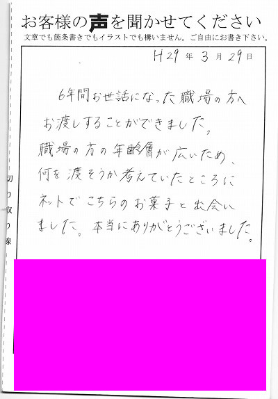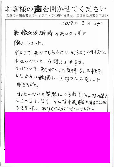 退職あいさつのお客様の声 72 『皆さんに”何これ!?かわいい!!」と好評でした』