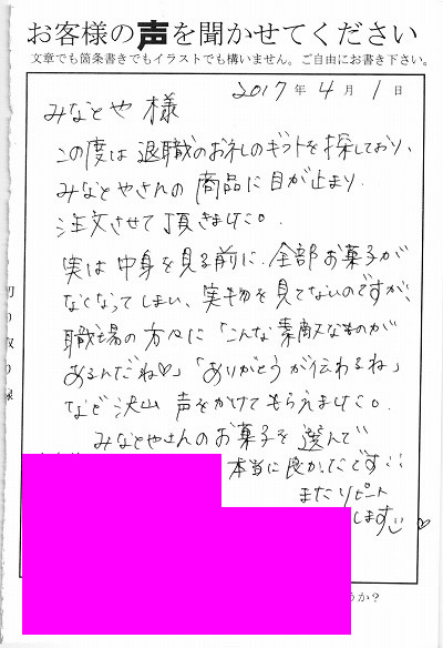 この度は退職のお礼のギフトを探しており、みなとやさんの商品に目が止まり注文させて頂きました。実は中身を見る前に全部のお菓子がなくなってしまい、実物を見ていないのですが、職場の方々に「こんな素敵なものがあるんだね」「ありがとうが伝わるね」など沢山声をかけてもらえました。みなとやさんのお菓子を選んで良かったです!!またリピートします。