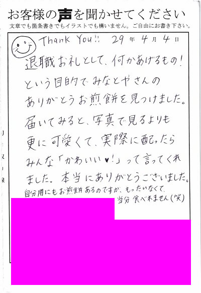 退職お礼として何かあげるもの!という目的でみなとやさんのありがとうお煎餅を見つけました。届いてみると写真で見るよりも更に可愛くて実際に配ったらみんな「かわいい!」って言ってくれました。本当にありがとうございました。自分用にもお煎餅あるのですが、もったいなくて当分食べれません(笑)