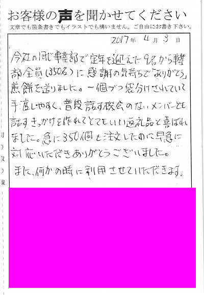 会社の同じ事業部で定年を迎えた9名から事業部全員(350名)に感謝の気持ちで「ありがとう」煎餅を送りました。一個づつ袋分けされていて手渡ししやすく普段話す機会のないメンバーとも話すきっかけを作れてとてもいい返礼品と喜ばれました。急に350個も注文したのに早急に対応いただきありがとうございました。また何かの時に利用させていただきます。