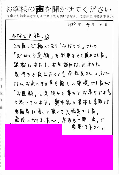 この度、ご縁があり「みなとや」さんの「ありがとう煎餅」を利用させて頂きました。退職にあたり、お世話になった方々に気持ちを伝えたくても全社員さんになかなかお会いする事も難しい環境でしたが、「お煎餅」に気持ちを乗せてお届けできたと思っています。熨斗紙の書体も素敵な雰囲気に書いて頂いて大満足でした。最後になりましたが、今後も「一期一会」で頑張って下さい。