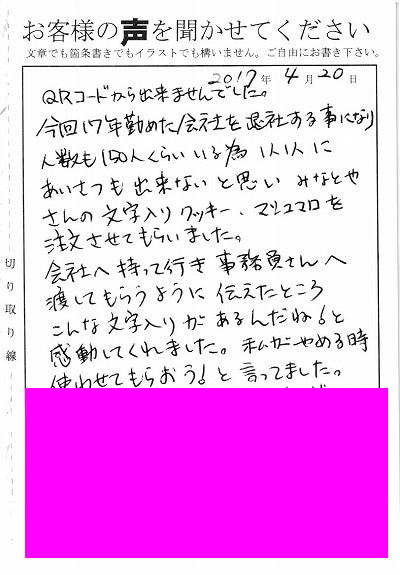 QRコードから出来ませんでした。今回17年勤めた会社を退職する事になり、人数も150人くらいいる為、1人1人にあいさつも出来ないと思いみなとやさんの文字入りクッキー、マシュマロを注文させてもらいました。会社へ持って行き事務員さんへ渡してもらうように伝えたところこんな文字入りがあるんだね!と感動してくれました。私がやめる時使わせてもらおう!と言ってました。