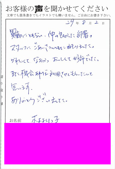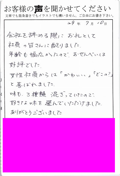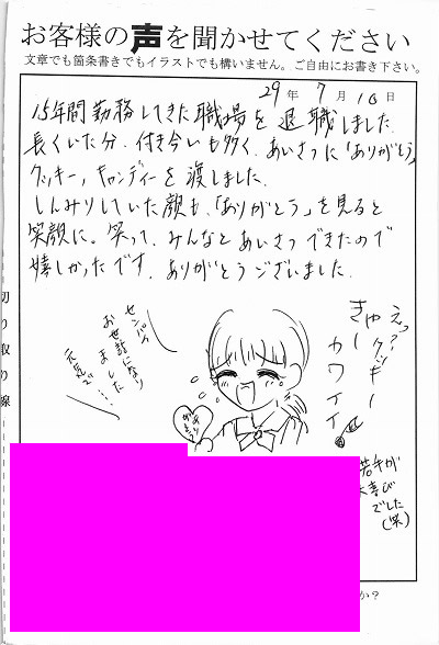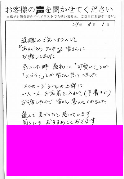 退職あいさつのお客様の声 80『かわいくてなおかつおいしくて好評でした』