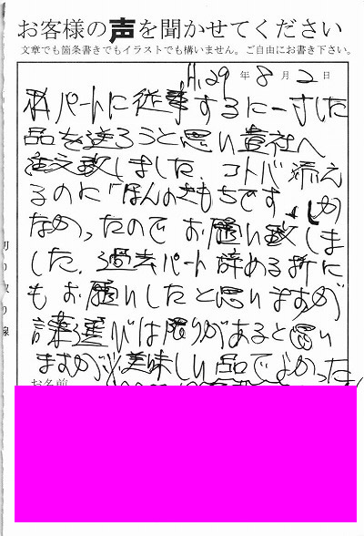 私、パートに従事するに一寸した品を送ろうと思い貴社へ注文致しました。コトバ添えるのに「ほんのきもちです」しかなかったのでお願い致しました。過去パート辞める折にもお願いしたと思いますが、言葉選びは限りがあると思いますが美味しい品でよかった。