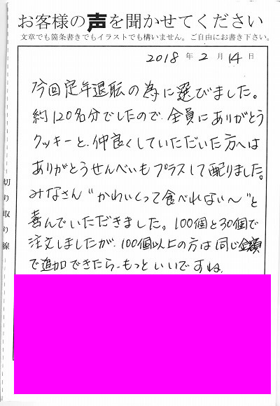 今回定年退職のために選びました。約120名分でしたので全員にありがとうクッキーと仲良くしていただいた方へはありがとうせんべいもプラスして配りました。みなさんかわいくって食べられない~と喜んでいただきました。100個と30個で注文しましたが100個以上の方は同じ金額で追加できたらもっといいですよね。