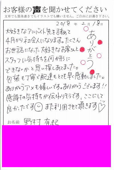 大好きなアルバイト先を辞めて4月から社会人になります。お世話になった大好きなお客さんとスタッフに気持ちを何か形にできないかと思い探し当てました。包装も丁寧で配達もとても早く感動しました。ありがとうアメも嬉しいです。ありがとうございます!!感謝のきもちが伝わりそうで、ここにして良かったです。また利用させて頂きます。