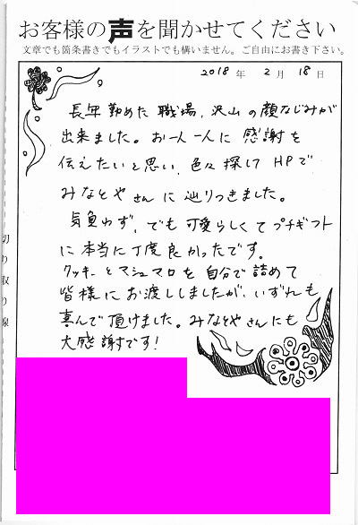 長年勤めた職場、沢山の顔なじみが出来ました。お一人お一人に感謝を伝えたいと思い色々捜してHPでみなとやさんに辿りつきました。気負わず、でも可愛らしくプチギフトに本当に丁度良かったです。クッキーとマシュマロを自分で詰めて皆様にお渡ししましたがいずれも喜んで頂けました。みなとやさんにも感謝です!