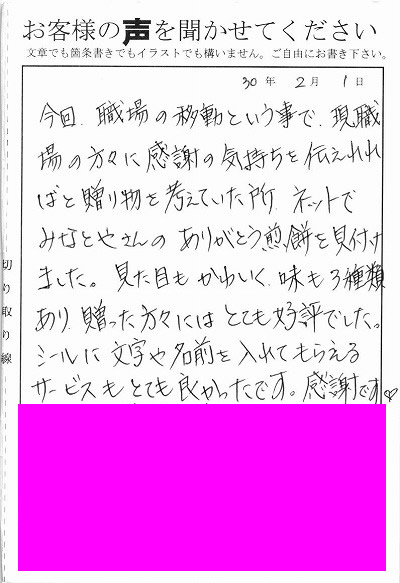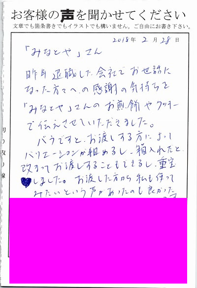退職あいさつのお客様の声 89『シールに文字や名前を入れてもらえるサービスもとても良かったです』