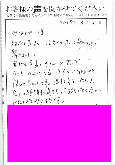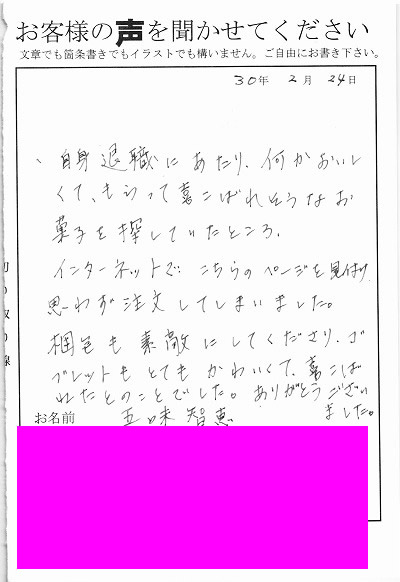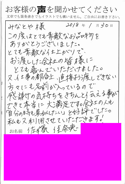 この度はとても素敵なお品物をありがとうございました。とても素敵な仕上がりで、お渡しした会社の皆様にとても喜んでいただけました。又、仕事の都合上、直接お渡しできない方々にも名前が入っているので、感謝の気持ちを伝える事ができて本当に大満足です。会社の人も「自分の時も真似したい」と好評でした。私も又利用させていただきます。