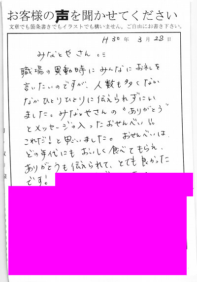 退職あいさつのお客様の声 93 『ネットでみるよりおせんべいがしっかりと大きく、「すごーい!!」と何人にも言われました』