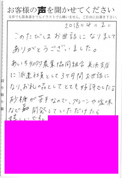こんたびはお世話になりましてありがとうございました。あいち知多農業協同組合美浜支店に派遣社員として3ヶ月間お世話になり、お礼の品としてとても好評でした。砂糖が苦手なので、プレーンや塩味などを開発していただけたら嬉しいです。