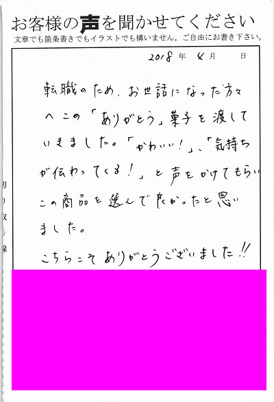 転職のため、お世話になった方々へこの「ありがとう」菓子を渡していきました。「かわいい!」、「気持ちが伝わってくる!」と声をかけてもらいこの商品を選んで良かったと思いました。こちらこそありがとうございました!!