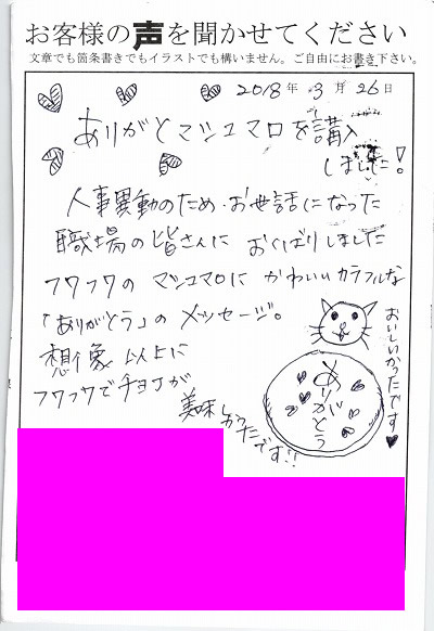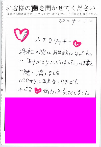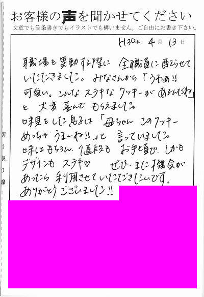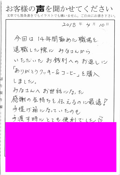 退職あいさつのお客様の声 95 『「母ちゃん。このクッキーめっちゃうまいね!!」と言っていました』