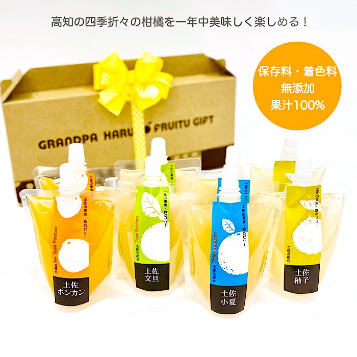 着色料・保存料無添加のゼリーギフトセット。高知県産の無農薬・有機栽培果実(文旦・ポンカン・小夏・柚子)を使用した、安心して食べられる飲むゼリーです。旬の果実の味をそのまま閉じ込めており、凍らせてシャーベットとしても楽しめます。