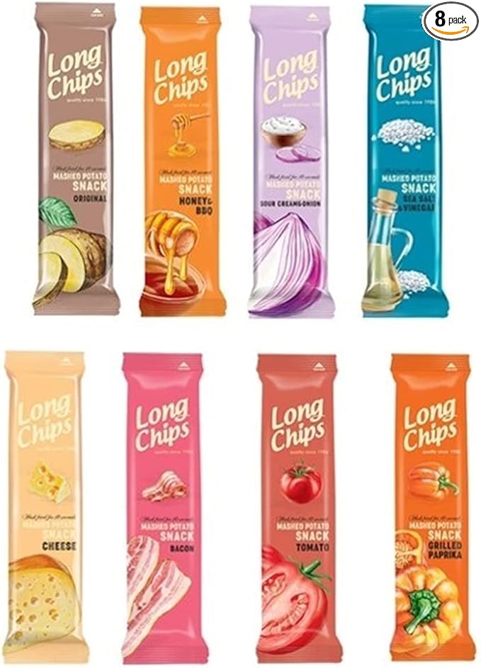 ラトビア発のロングサイズポテトチップス8種セット。マッシュポテトを薄く成型したユニークな形状で、パリパリ食感が楽しめます。シーソルト&ビネガーやハニーバーベキューなど、多彩な味が揃っており、大人から子どもまで幅広く好まれるラインナップです。軽量で持ち運びやすく、手が汚れにくいのも魅力です。