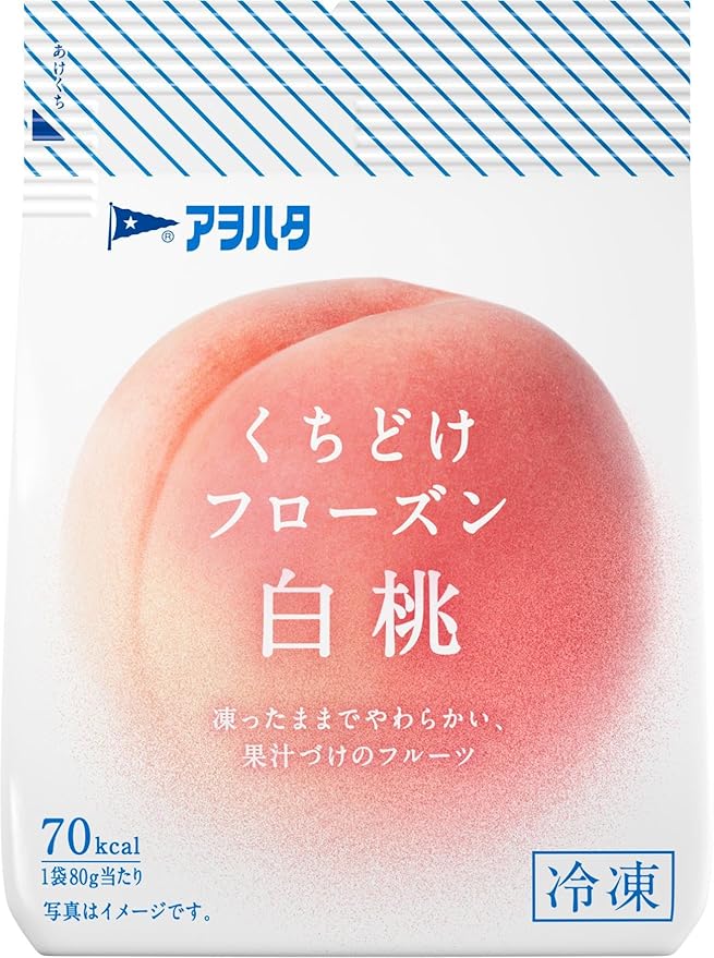 アヲハタの「くちどけフローズン白桃」は、やわらかフローズン製法で凍らせた一口サイズの白桃を楽しめる冷凍デザートです。果物本来の甘みと芳醇な香りが特徴で、冷たい差し入れとしてバーベキューでも重宝されます。1袋80gあたり70kcalとカロリー控えめなのも嬉しいポイントです。