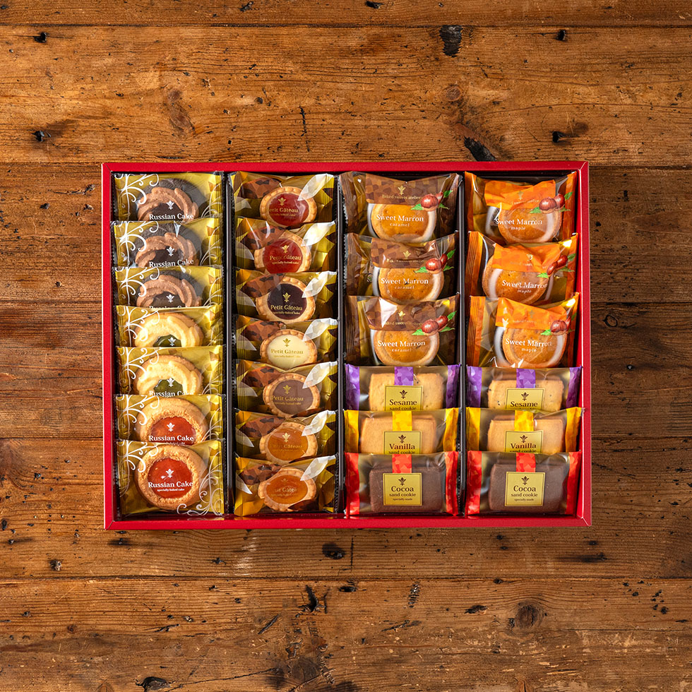 合計26個の個包装で配りやいロシアケーキ詰め合わせは、包装済・のし対応で急ぎの差し入れにも便利です。しっかり満足できる厚焼きクッキーに、ジャムやクリームの彩りが映えるため、楽屋の卓上が一気に華やぎます。取り分けが簡単で休憩中もサッと配布できます。