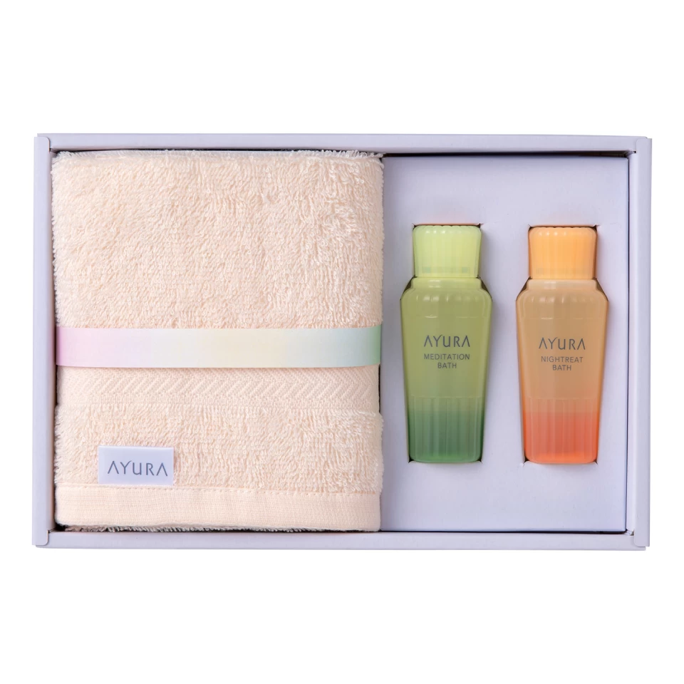 アロマティックハーブのやさしい香りで気分をほぐせるアユーラ 入浴料&タオルセットは、送別会のプチギフトとして上品さと実用性を両立しやすい商品です。入浴料2種とウォッシュタオルが入っており、仕事や引っ越し準備で忙しい相手にも、ほっとする時間を届けやすい点が魅力です。